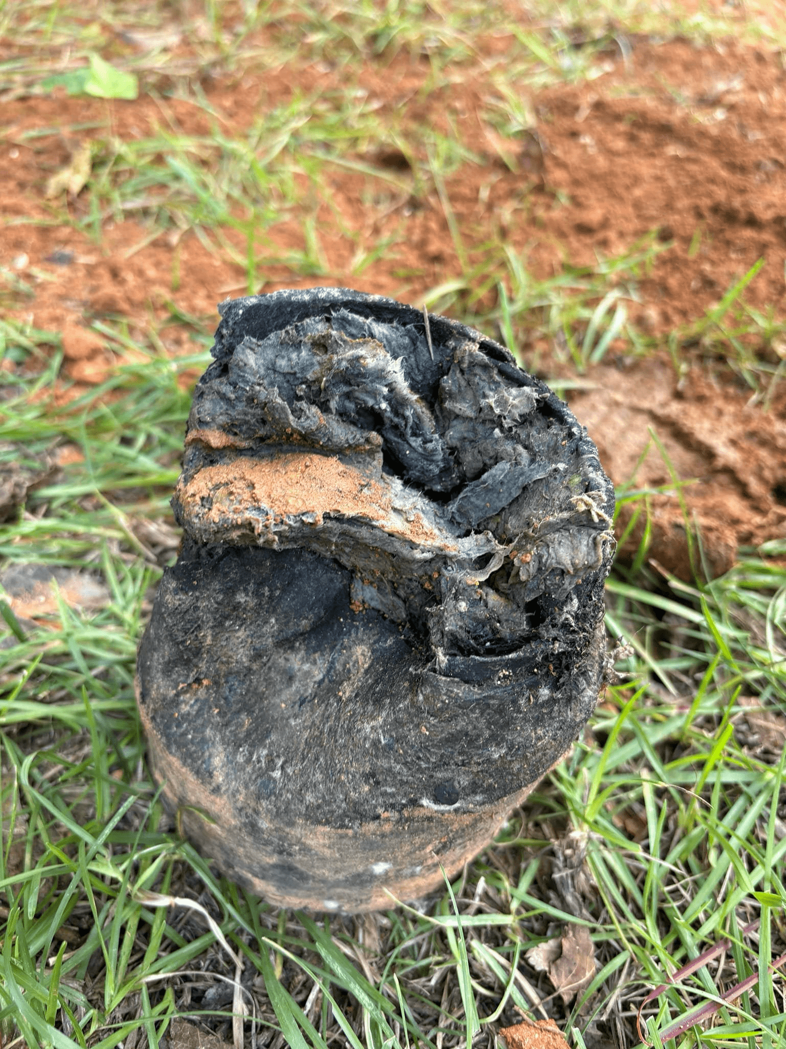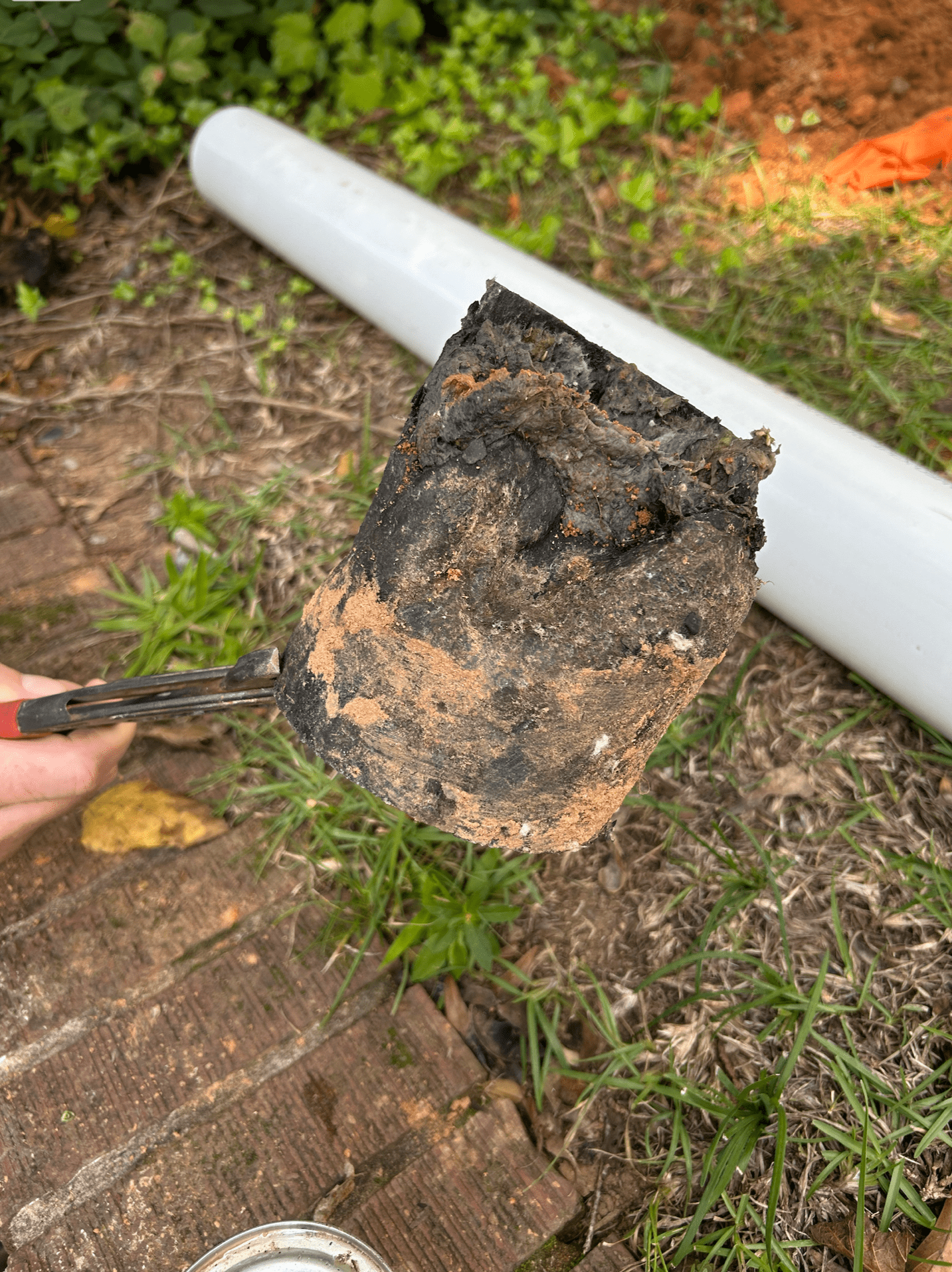 What we found next was the true cause of the collapse: a short section of Orangeburg pipe. This fiber-based pipe was commonly used between the 1940s and 1970s throughout Spartanburg County, but it is now known to be unreliable, especially when ground settles and there is shifting soil or root intrusion. If you’ve never seen Orangeburg pipe, it’s basically super dense cardboard!