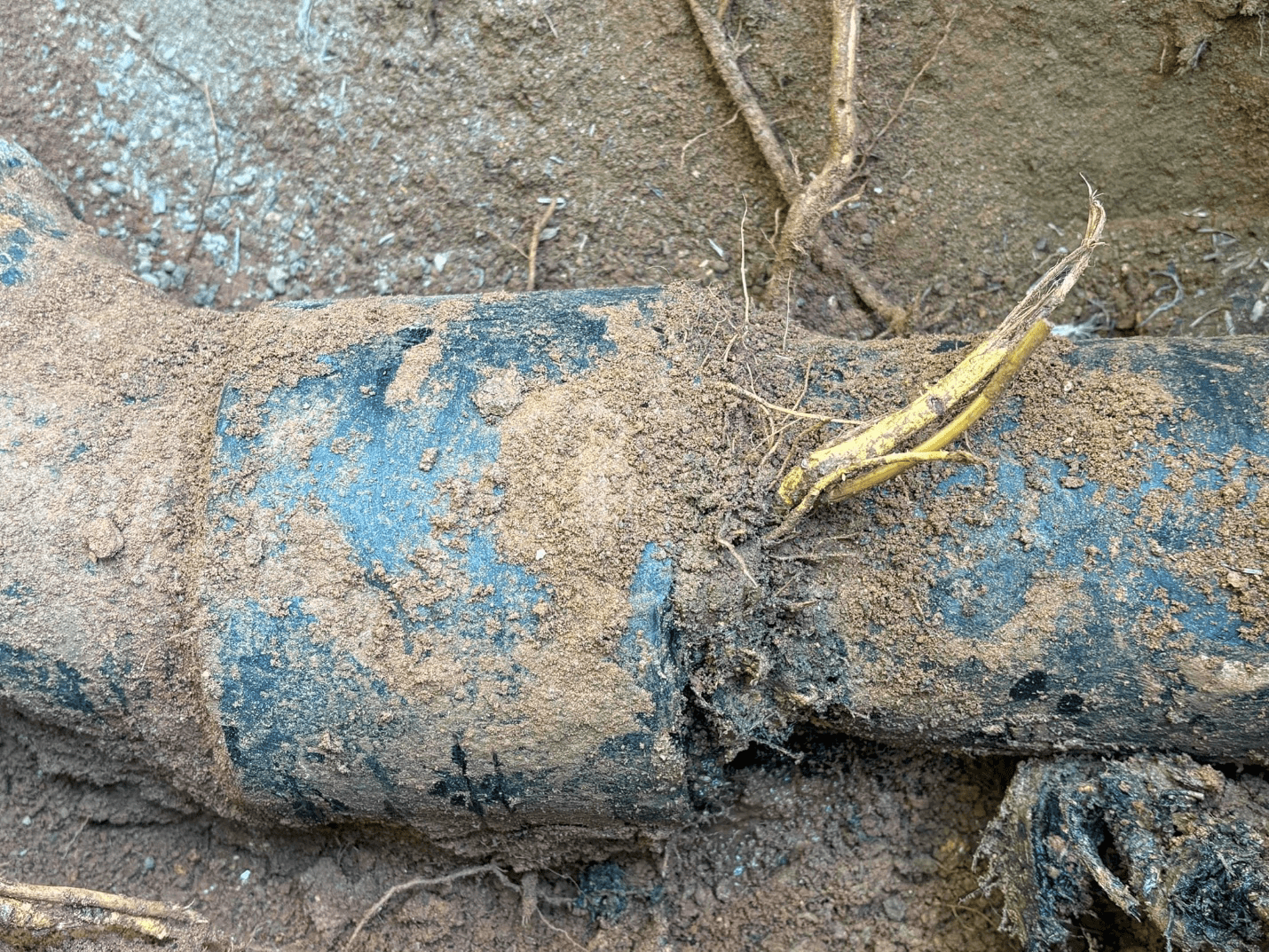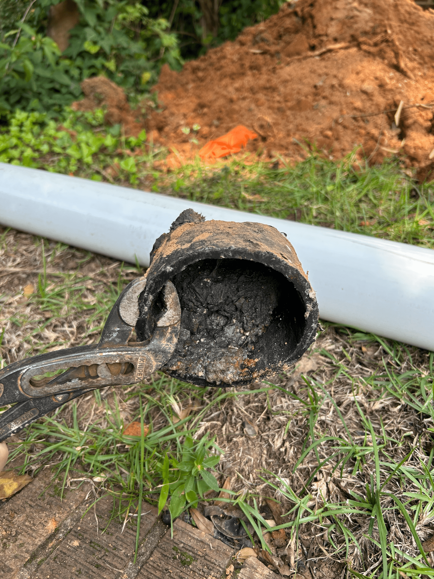 The Orangeburg pipe had fully collapsed, creating an opening where nearby vegetation had invaded the line, forming a total blockage.