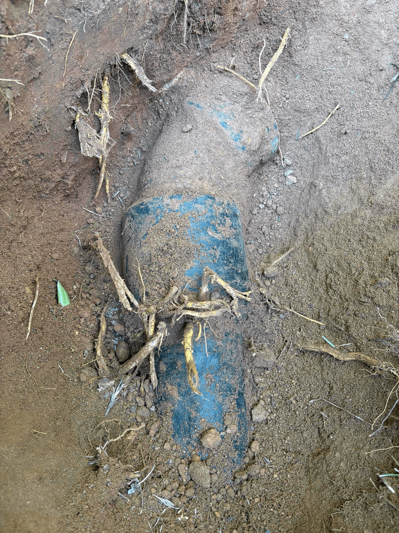 Once Kory and Jacob began digging, we uncovered the original 4-inch cast iron sewer line installed in the 1950s. Cast iron can last a long time (there are many homes in Spartanburg County still using cast iron sewer lines, including Inman, Pacolet, Cowpens, Spartanburg- essentially all throughout the county!), but it is prone to corrosion and buildup over the decades. In this case, however, the cast iron itself wasn’t the cause of the problem.